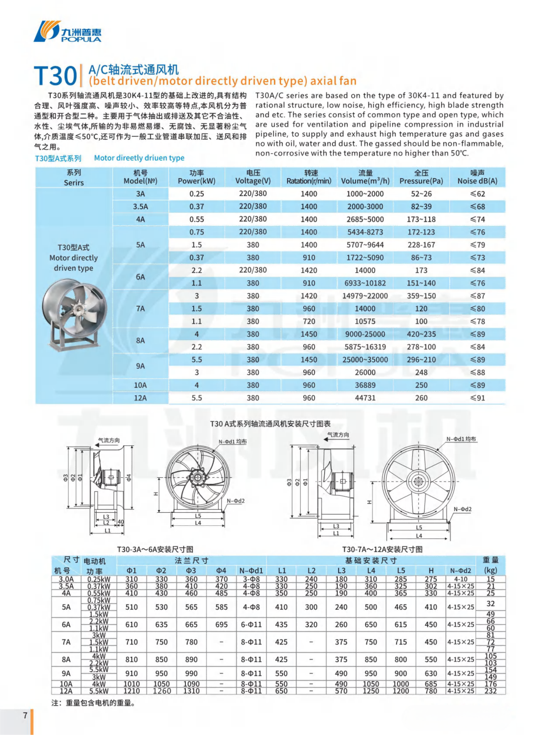 T30(A)轴流风机是30K4-11型的基础上改进的,具有结构合理、风叶强度高、噪声较小、效率较高等特点。