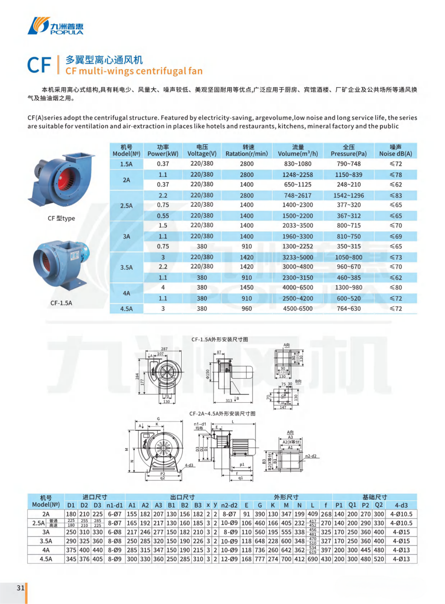 CF多翼离心通风机采用离心式结构,具有耗电少、风量大、噪声较低、美观堅固耐用等优点,广泛应用于厨房、宾馆酒楼、厂矿企业及公共场所等通风换气及抽油烟之用。