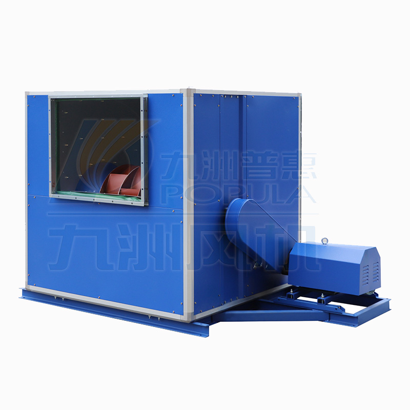 HKF箱式离心风机用于厨房油烟抽送,叶轮采用单板后倾弧型设计,对叶片附着油烟有易于清洗的特点,